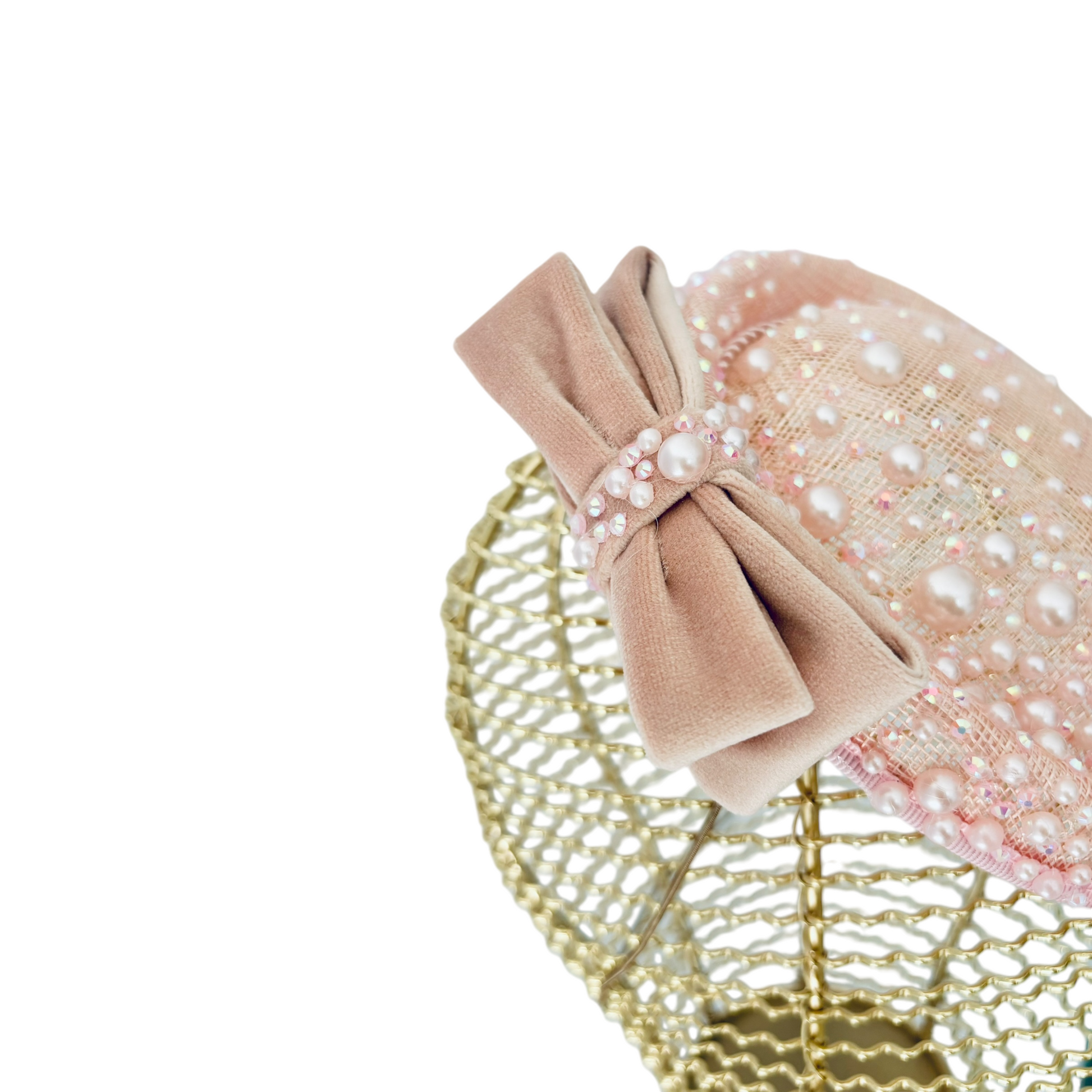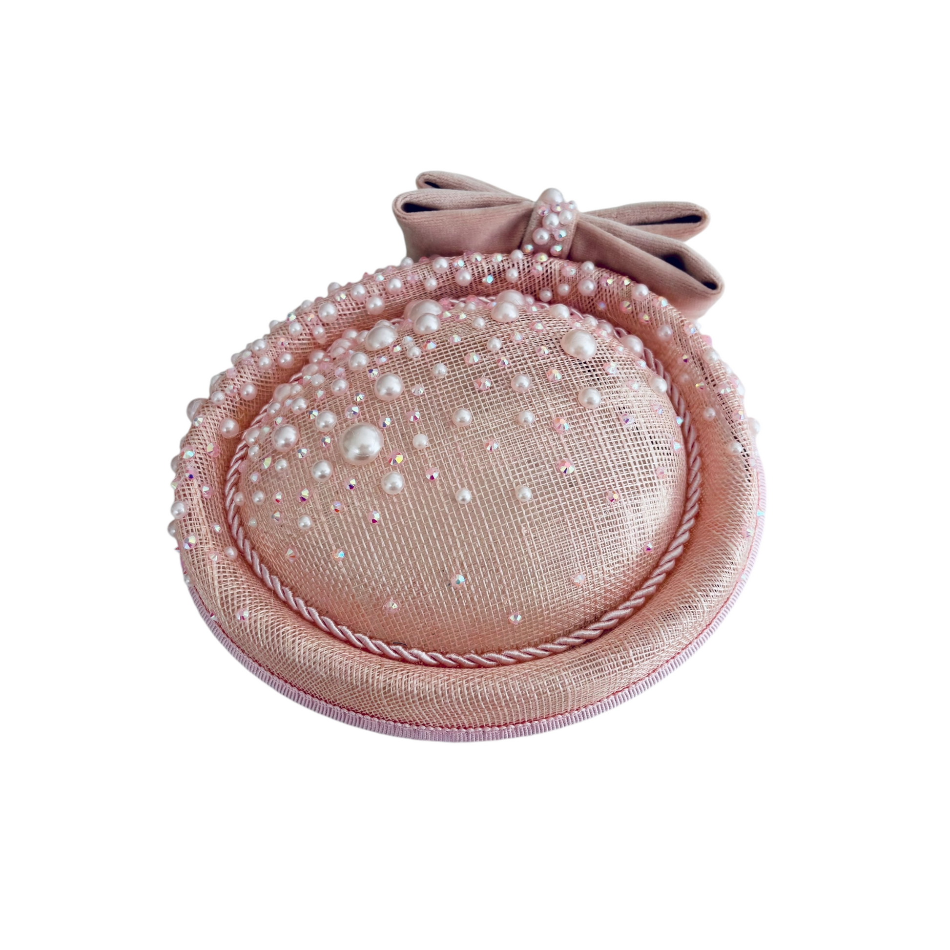 A stunning one-off handmade statement piece in a blush pink shade, embellished with champagne rose pearls as well as iridescent diamantés and finished with a fabulous velvet crystal encrusted bow. This is a standout design inspired by vintage pillbox headpieces but with a more contemporary twist. Perfect for formal occasions such as Ascot, Chester, Aintree races or making an elegant statement at a summer event.