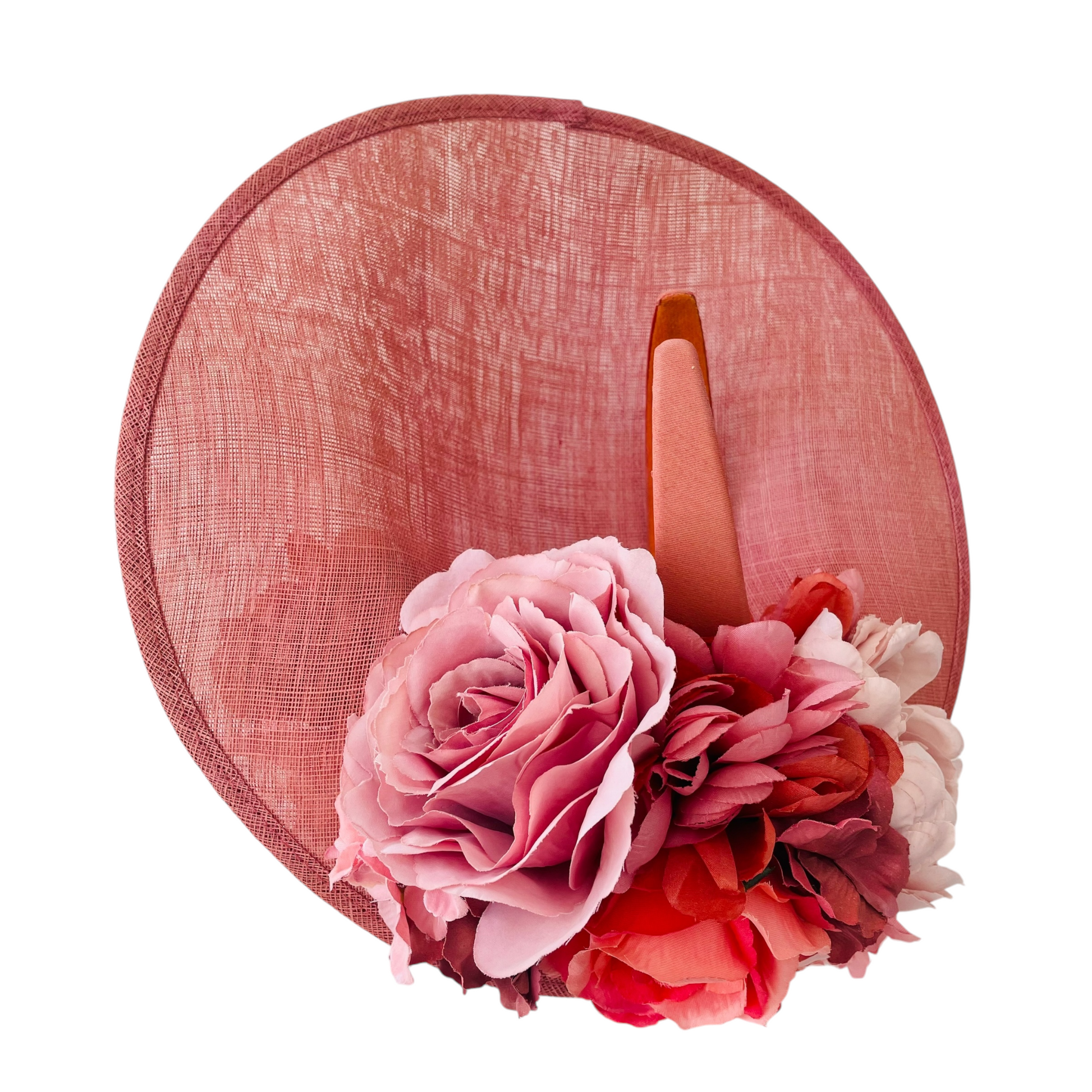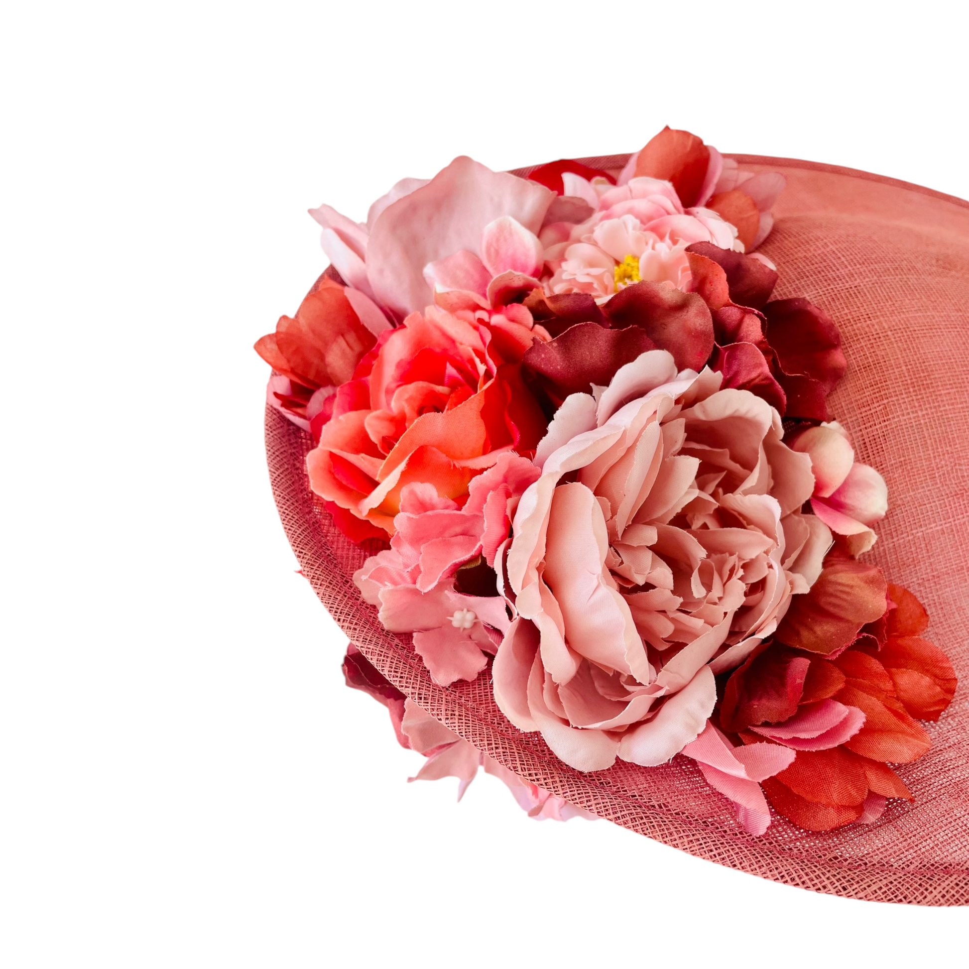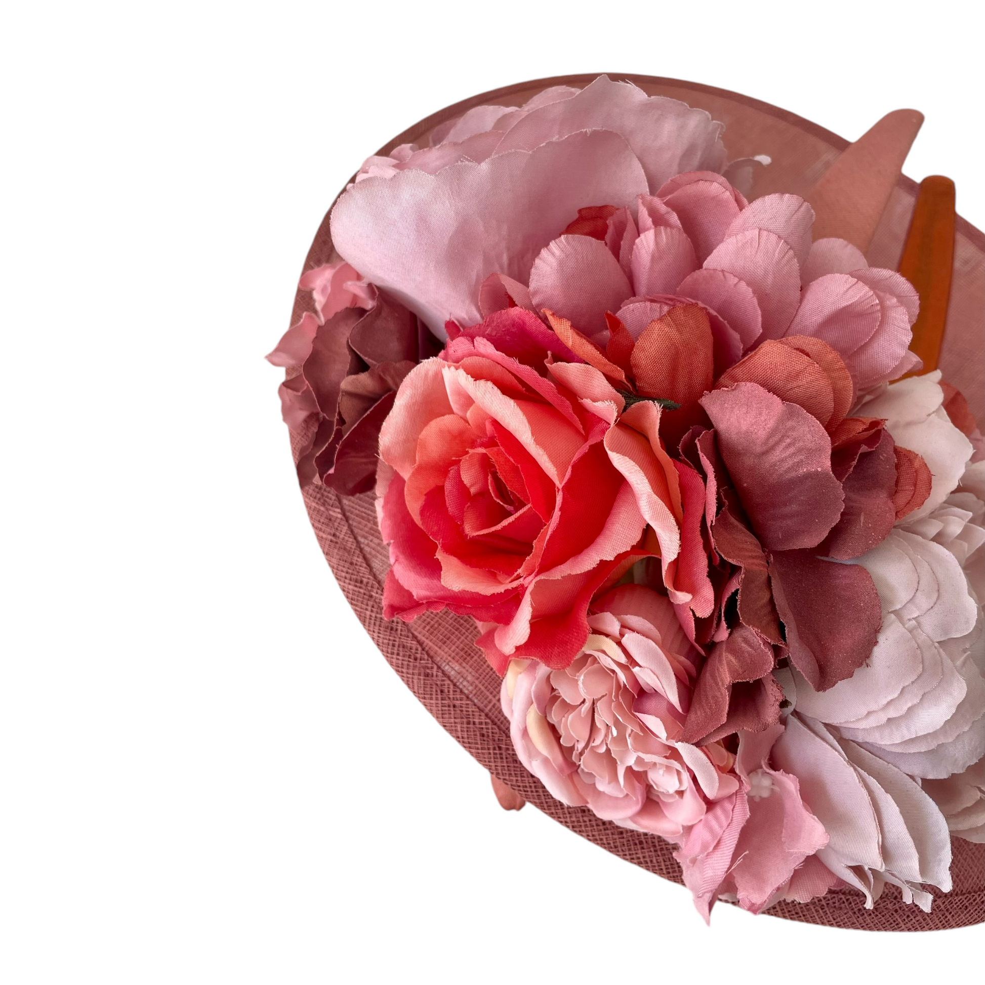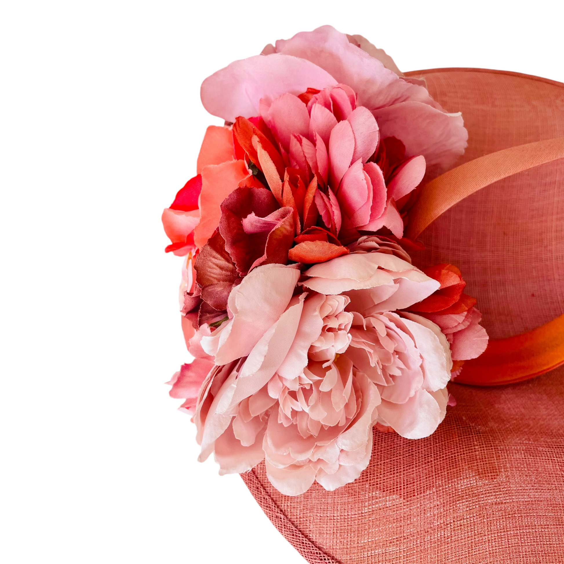 A beautiful handmade statement hat designed bespoke, with a gorgeous selection of florals in mixed shapes and sizes to make this a standout piece which is both elegant and unique. Flowers in bright pinks and pale vintage blush shades as well as pale peaches and deeper coral tones. In a side dipped saucer style for a modern look, fitted with a matching hairband, this design measures 37cm. This piece has flowers both on top and underneath for a look that is elegant from all angles. Perfect for formal occasions such as Ascot, Chester, Aintree race meets or making an elegant statement at a wedding.