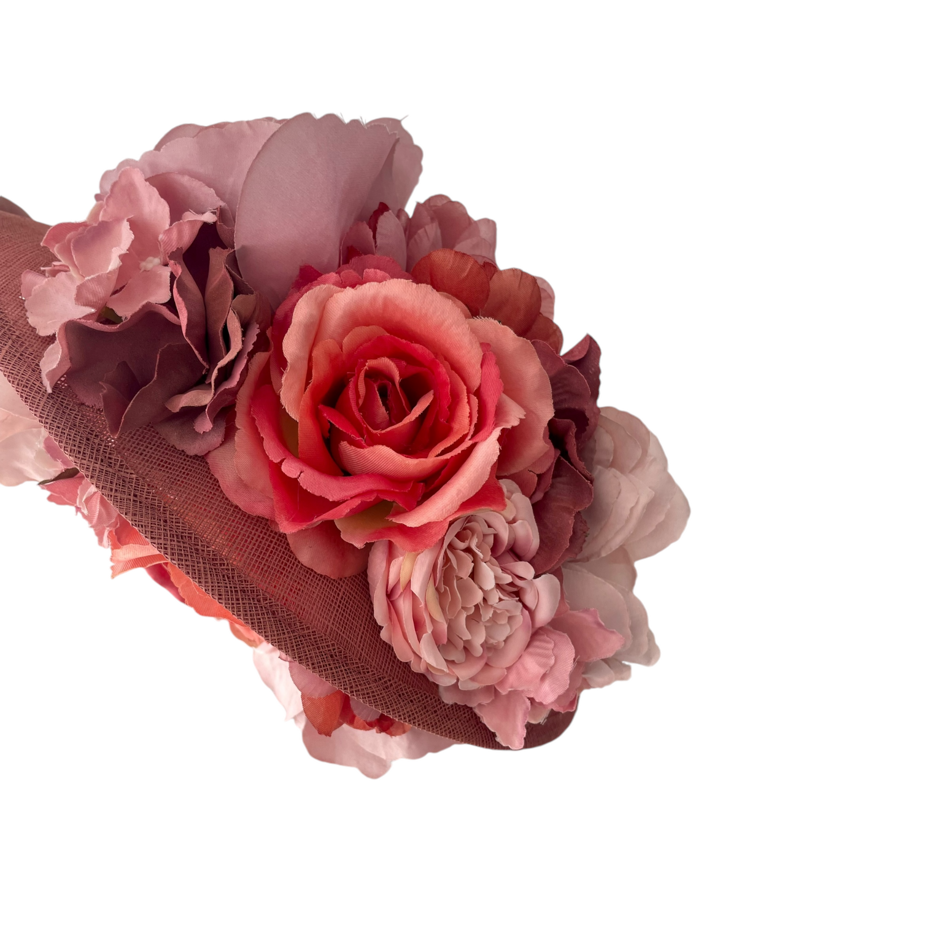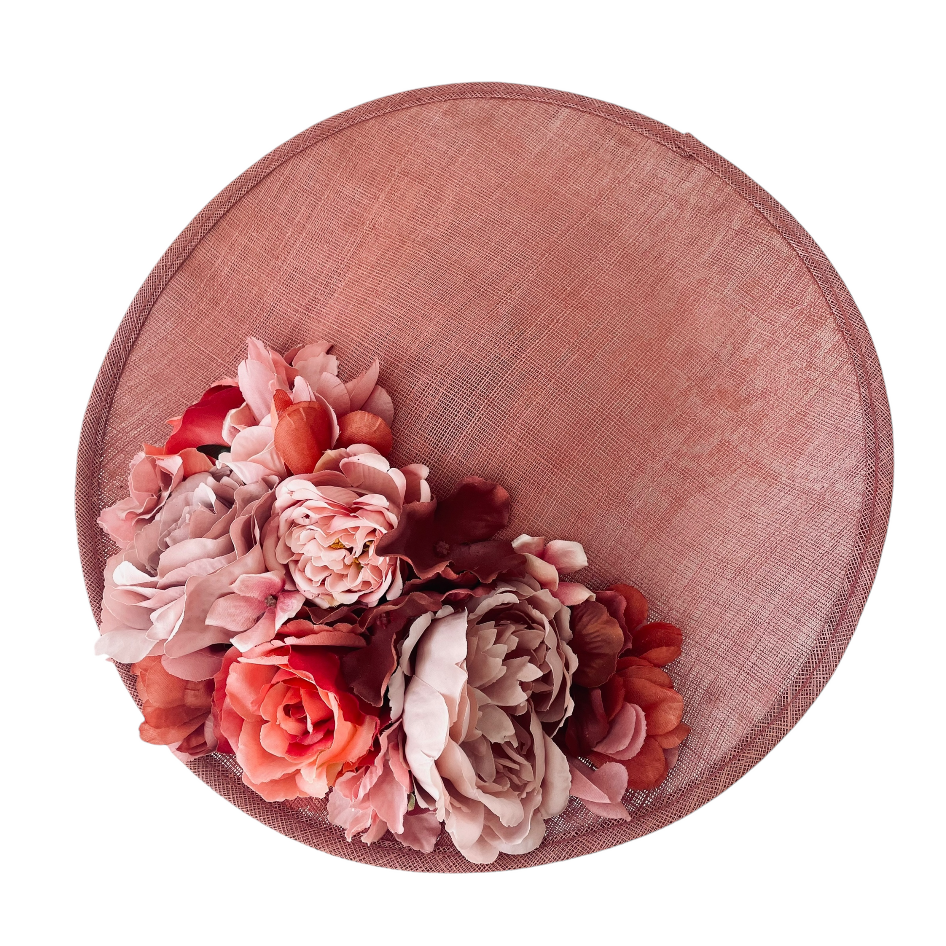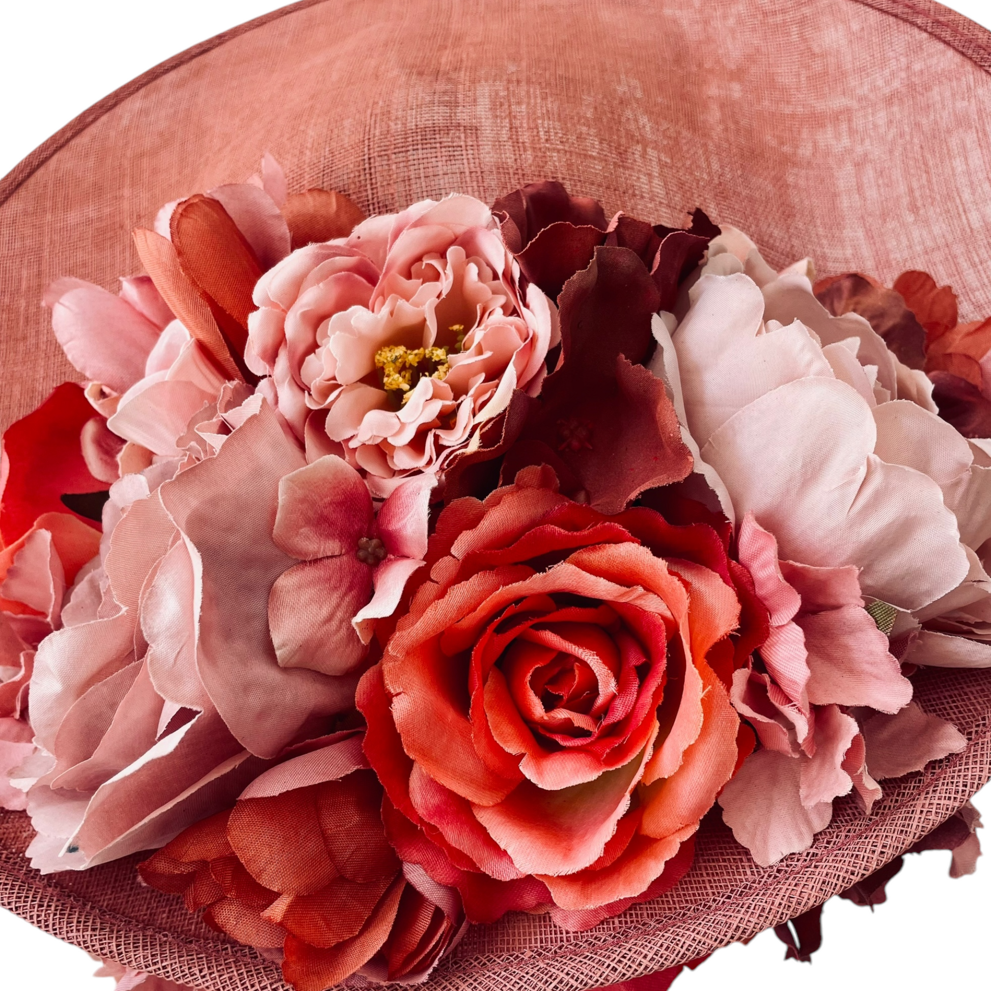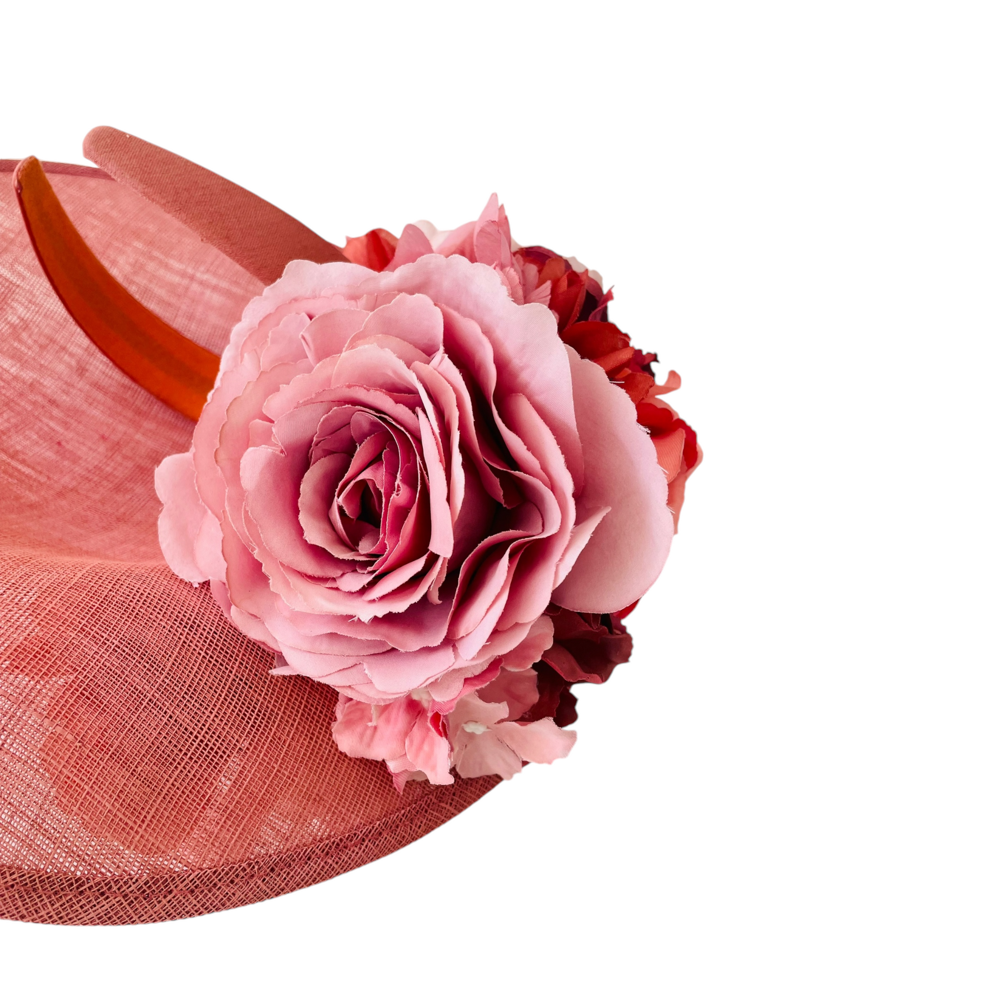 A beautiful handmade statement hat designed bespoke, with a gorgeous selection of florals in mixed shapes and sizes to make this a standout piece which is both elegant and unique. Flowers in bright pinks and pale vintage blush shades as well as pale peaches and deeper coral tones. In a side dipped saucer style for a modern look, fitted with a matching hairband, this design measures 37cm. This piece has flowers both on top and underneath for a look that is elegant from all angles. Perfect for formal occasions such as Ascot, Chester, Aintree race meets or making an elegant statement at a wedding.